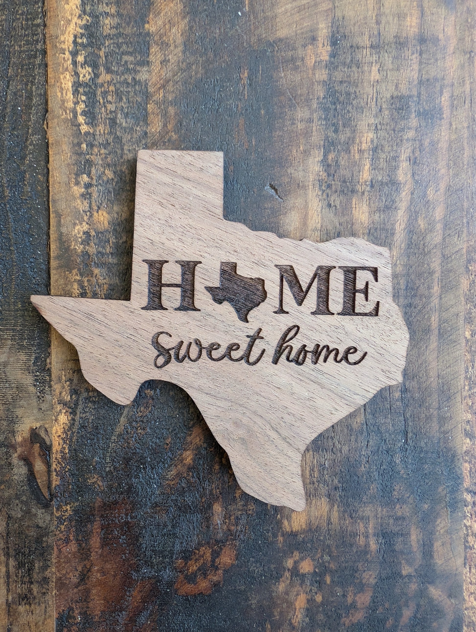Show off your Texas pride with this beautifully crafted Texas-shaped magnet, laser cut from 4mm walnut wood. Featuring a rich, natural finish, this durable and stylish magnet adds rustic charm to any fridge or magnetic surface. A perfect gift or keepsake for any Texan at heart!