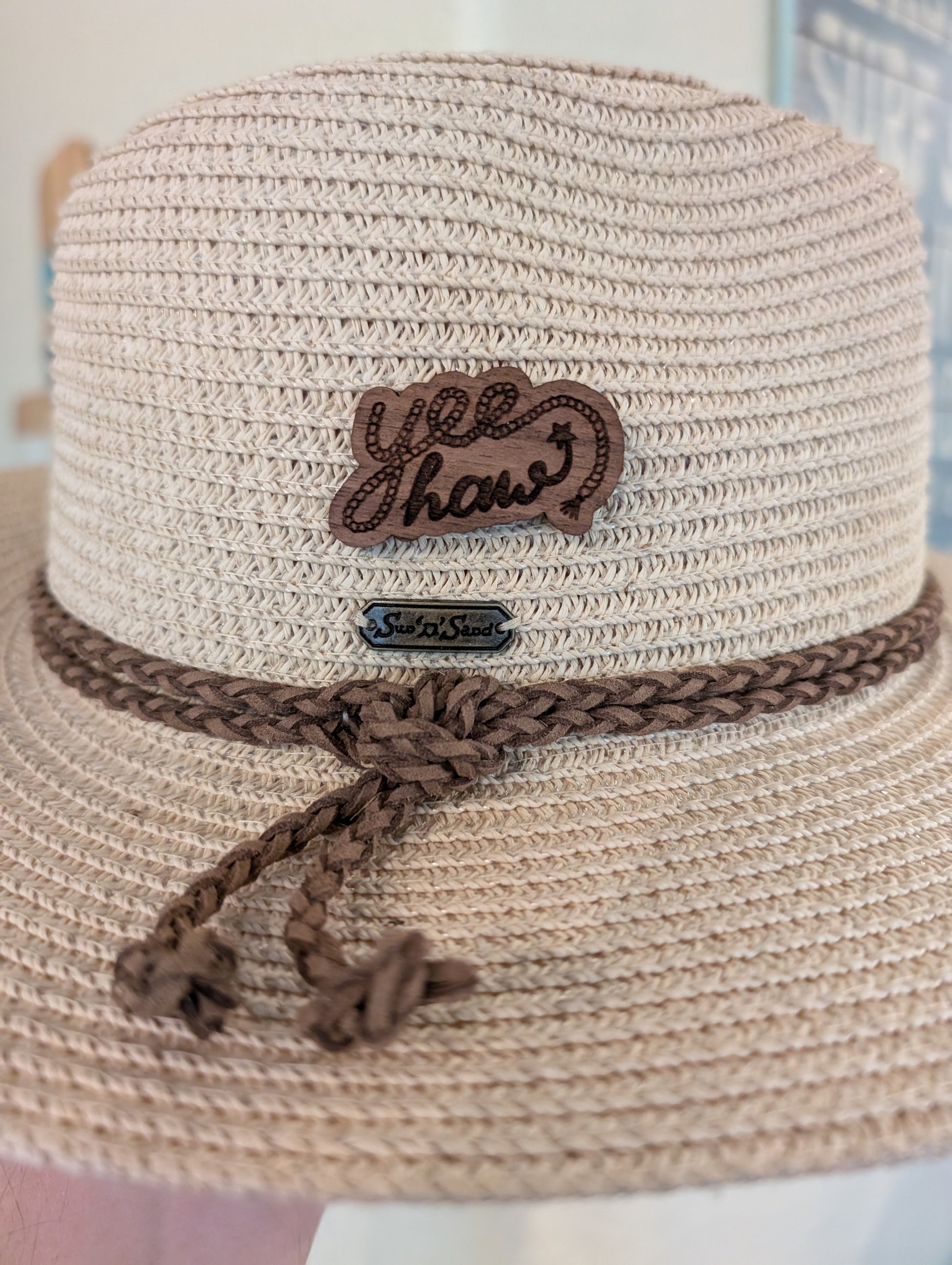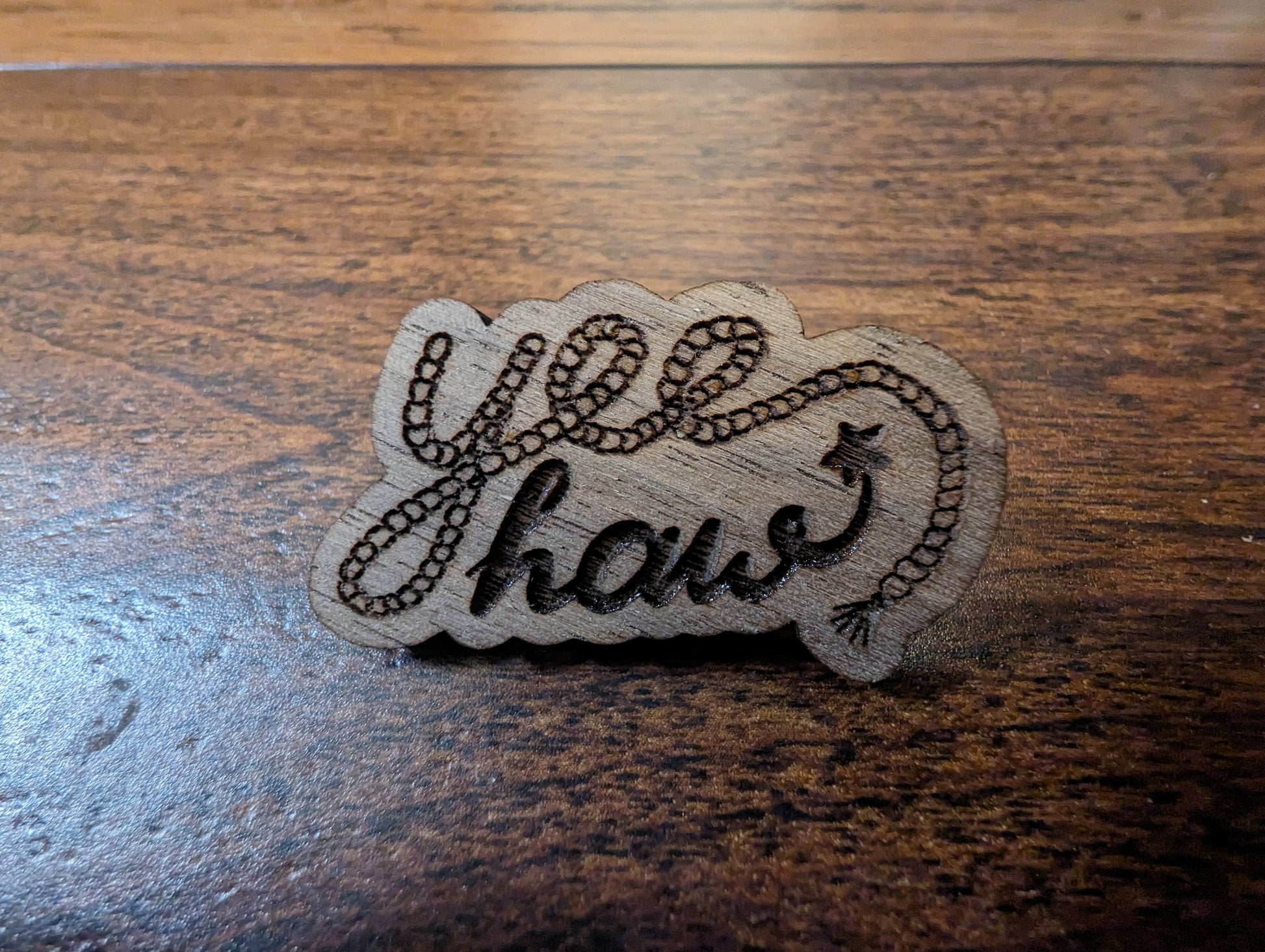 Discover our lasercut 'Yee Haw' pin made from walnut wood. Perfect for adding a rustic, country flair to any outfit or accessory.